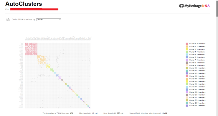Resultan muy interesantes estas agrupaciones por colores, pero lo realmente útil es la parte inferior, que es la que nos va a ayudar a "triangular" parientes. Vemos que cada agrupación o clúster contiene los parientes ordenados según el criterio que queramos, normalmente el tamaño de los segmentos compartidos. La última columna denominada "Tree" nos indica el número de personas que incluye el árbol de ese pariente. Hay que centrarse en esto.