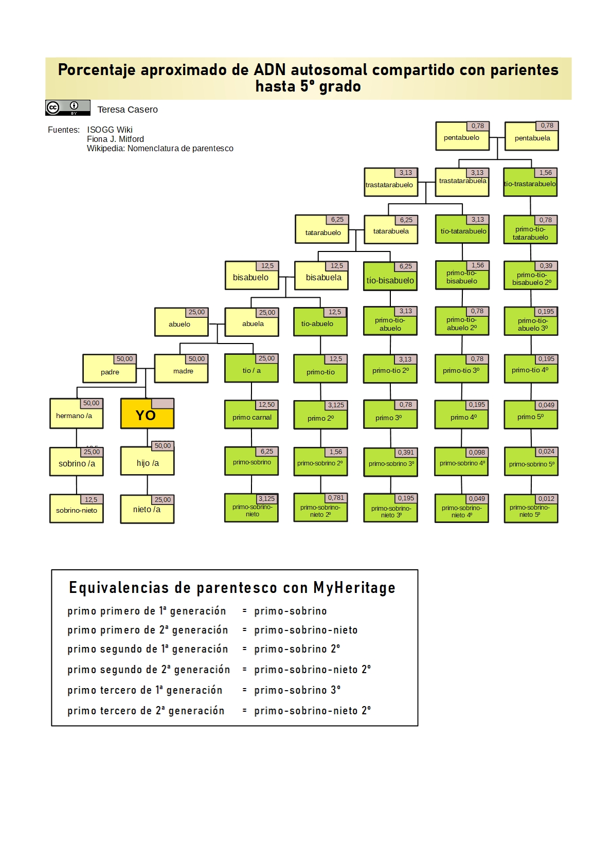 Tanto MyHeritage como 23andme y otras plataformas similares poseen sus propios algoritmos de cálculo de este grado de parentesco. Además, disponemos del cuadro de dnapainter que nos puede orientar sobre estos valores. El cuadro elaborado por nuestra colaboradora Teresa Casero, en castellano, similar al de dnapainter pero en castellano, también nos puede venir bien.